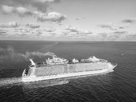 Miami tour. Cruise ship voyage. Aerial view of cruise in summer vacation. Cruise ship tour and travel at sea. Aerial view of luxury liner voyage. Ship leaving Miami beach port. Scenic deck views