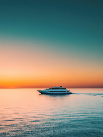A luxury cruise ship sails through calm waters against a breathtaking sunset sky, offering a sense of grand travel adventures
