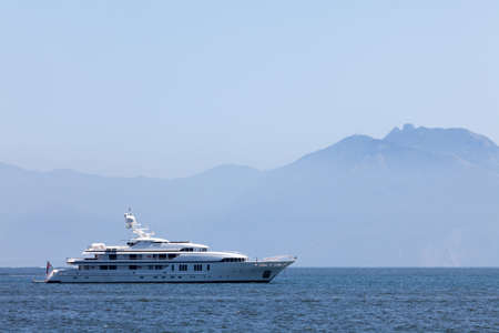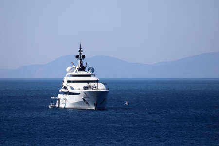 Large white motor yacht anchored in the bay mountain