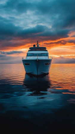 A luxury yacht gracefully navigates calm waters as the sun sets, casting beautiful hues across the horizon and reflecting on the sea.