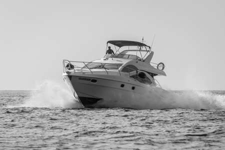 Male, Maldives - November 17, 2017: Speed boat fast cruising in the sea at Maldives, North Male Atoll (Kaafu Atoll), Asia, Indian Ocean. Black and white photography.
