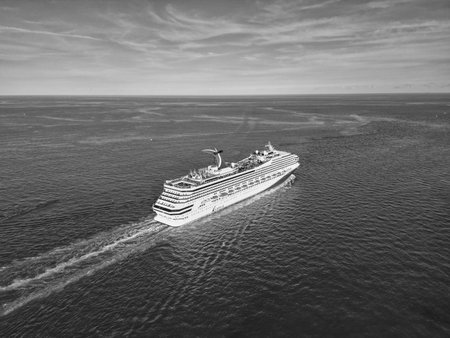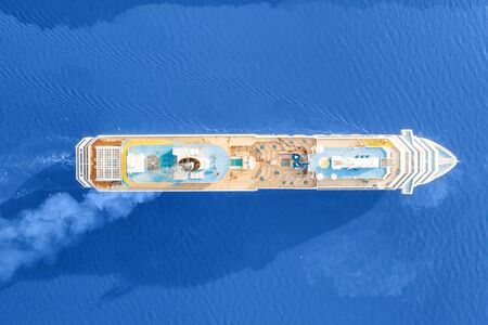 Luxury cruise ship sailing across the sea. Aerial top view at sunny day