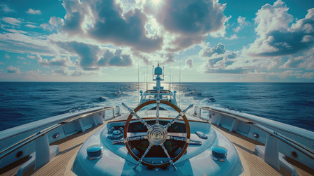 the ship wheel of a sleek yacht against the vast expanse of the sea, evoking a sense of freedom and exploration