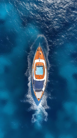 High-performance motor boat cutting through dark waters. Captured from a top view, with vibrant orange seats powerful movement and design for promoting water travel.