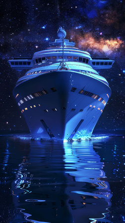 A cruise ship in the water at night. Generative AI image.