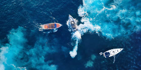 Croatia. Yachts at the sea surface. Aerial view of floating boat on blue Adriatic sea at sunny day. Travel - image