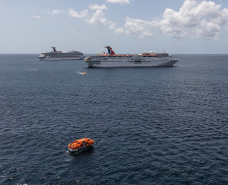 Saint Vincent - May 8, 2020: Aerial shot of Carnival Fascination anchored by the island. Two orange lifeboats sailing in the foreground. Carnival Valor, blue sky with white clouds in the background.