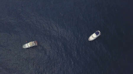 Aerial top down view two yachts stand at sea near white sandy beach Myrtos, Greece