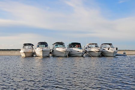 Six Yachts Tied Together Off a Sandy Shore