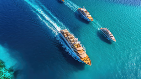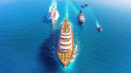 Stunning aerial view of majestic cruise ships gracefully navigating turquoise waters, with smaller boats dotting the serene seascape, embodying luxury travel.
