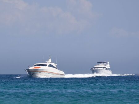 Luxury boat motor yacht. Luxury yacht in sea top view. Boating and yachting tourism. Luxurious lifestyle. Vacations on summer. Yacht at sea. Sea vacation on summer. Travel by sea. Sailing the ocean