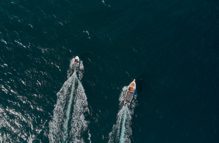 Aerial top down view of speed motor boat on open sea at summer day