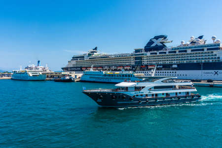 Pireaus Greece/ July 17, 2018: Cruise ship at dock with navy ship in foregournd