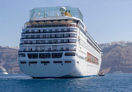 Cruise ship at the sea near the Greek Islands. Santorini island, Greece.