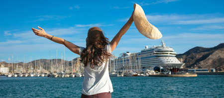 Cruise vacation. Rear view of tourist girl with backpack and hat standing in front of big cruise ship.