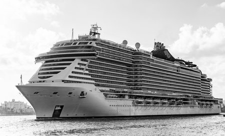 Cruise ship voyage. Majestic view of cruise in summer vacation. Cruise ship tour and travel at sea. Trip on luxury liner voyage. Ship leaving Miami beach port. Miami tour