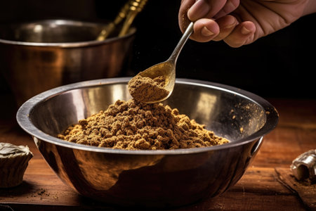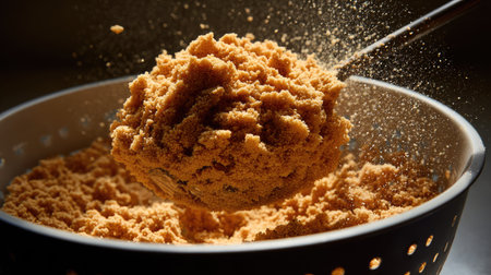 A stunning close-up of brown sugar being scooped from a colander, capturing the rich texture and granules as they fall in a sprinkling motion, set against dramatic lighting.