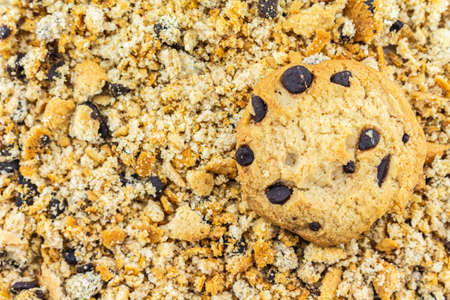 Scattered crumbs of chocolate chip butter cookies on white background.