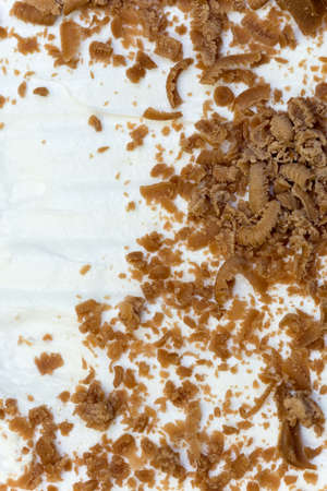 Close macro view chocolate cake grated chocolated background.