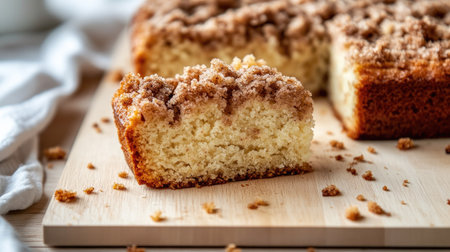 Close-up of a moist coffee cake with a crumbly streusel topping, arranged on a light wooden surface with a few crumbs.