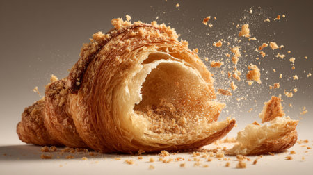 This stunning close-up depicts a flaky croissant surrounded by scattered crumbs, showcasing its delicate layers and inviting texture in soft light.
