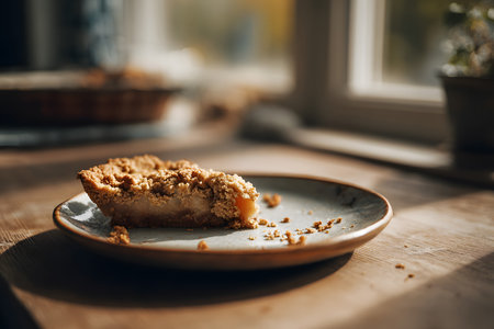 A slice of pie with a crisp crumb topping rests on a simple plate. Natural light filters through a window, creating a warm atmosphere in the cozy kitchen.