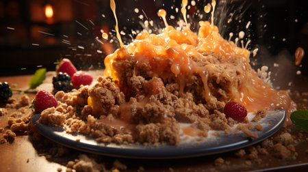 an intricately crafted oatmeal crumble, adorned with a caramel drizzle, takes center stage in this captivating visual storytelling masterpiece. rendered in cinema4d, this manipulated photograph showcases the artistry behind the creation. the uhd image, captured with a hasselblad 1600f, beautifully captures the essence of the applecore, merging intricate storytelling with stunning aesthetics. ai generated