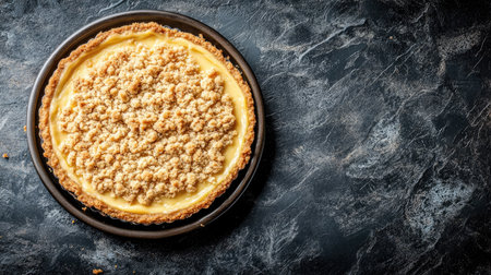 A delightful creamy pie topped with a crunchy crumble, set on a rustic dark table. Perfect for dessert lovers and ideal for any special occasion or gathering.