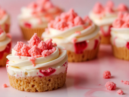 Close-up of mini cheesecake bites topped with swirls of creamy white frosting and bright pink crunchy strawberry crumbles. The cakes sit on a soft pink surface, surrounded by scattered crumbles. The background is smooth and pastel-toned, creating a sweet and vibrant mood.