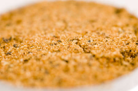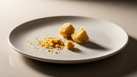 Small, golden-yellow cake crumbs and a few larger pieces are scattered on a plain white ceramic plate.