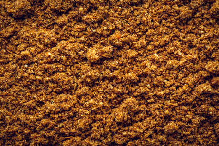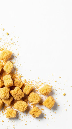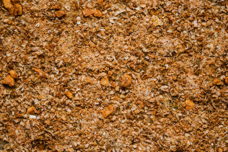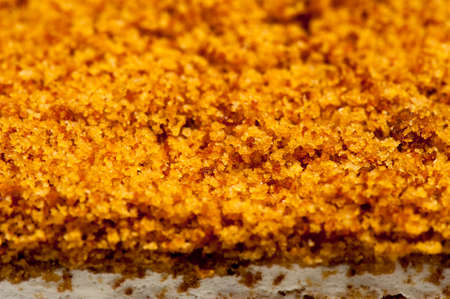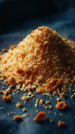 An abstract close-up of golden powder and crumbs scattered on a dark background, creating a textured and visually intriguing composition with a dramatic effect.