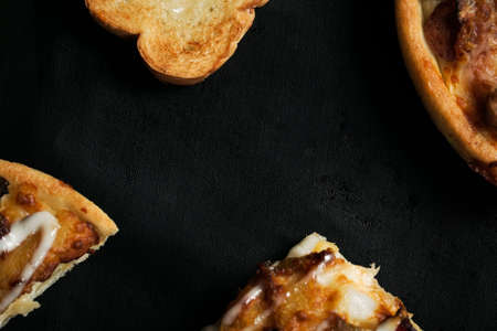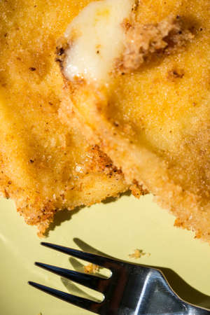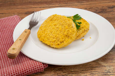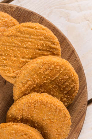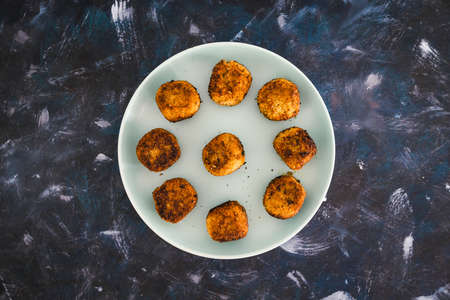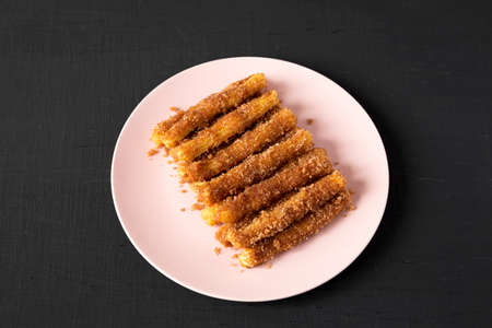 Wooden plate with fried breadcrumbs dark background. Rustic setting and food