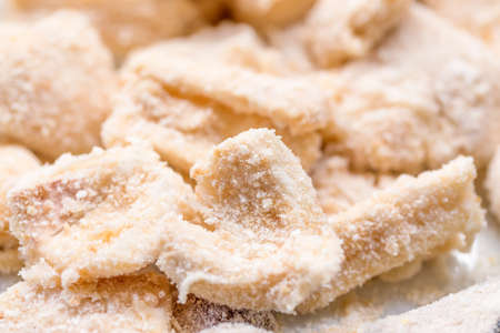 Top view of delicious fried popcorn chicken food in Taiwan for famous night market street food delicacy.