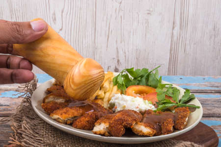 Pepper in male hands and hicken chop with vegetable and black pepper sauce in plate over wooden table