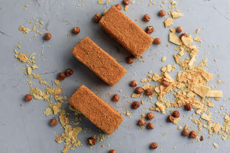 hand made delicious Napoleon cake with custard in a sprinkle of cakes