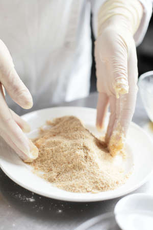 Raw ready to cook chicken breast fillets with breading, lemon and thyme