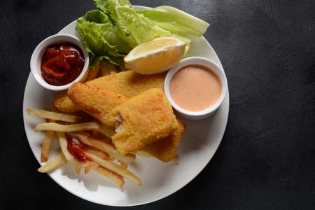 Traditional English Food - Fish and Chips. Fried fish filets and crispy French fries served with ketchup and homemade tarter sauce.
