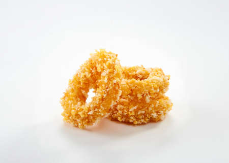 Close-up of stacked onion rings, isolated on a light beige background, with a focus on the crunchy, golden brown breading