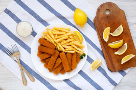 Homemade Fish Sticks and French Fries with Tartar Sauce on a white wooden background, low angle view.