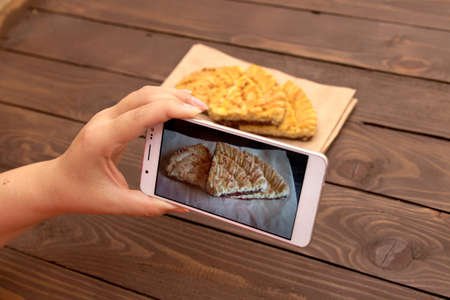 Food photography woman hands make photo cake with smartphone / taking photo food for post and share on social networks with camera smart phone in restaurant