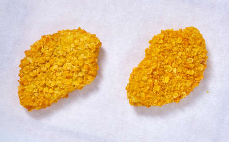 Stack Raw Frozen Chicken Nuggets. Several Chicken Nuggets In Breading Close-Up