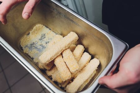 Crispy fried fish fingers isolated on white background. Top view Copyspace