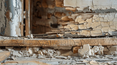 A close-up aerial view a heavily damaged brick building wall with exposed rebar and cracked plaster, set against a misty, atmospheric background, highlighting...