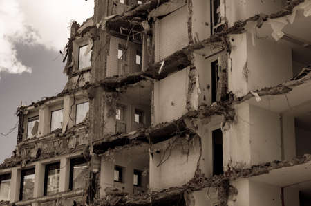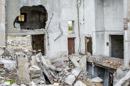 Destroyed building, rubble of house, Demolition of building. Waste and fragments of concrete, bricks and stones.