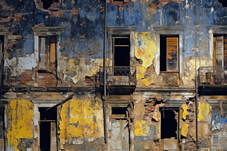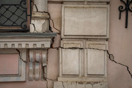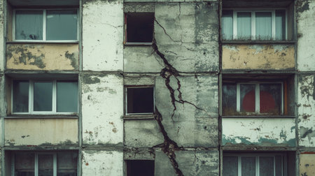 This image captures the cracked facade of a dilapidated building, highlighting the effects of neglect and urban decay in a residential environment.