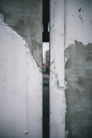 Close-up view of a crumbling wall featuring exposed concrete structures and broken debris, visually representing destruction and urban decay.