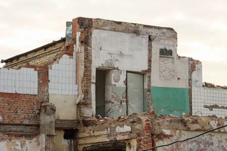 Post-war landscape. Ruined red brick house. War ruins. Destroyed city after a military attack. Bombed buildings. Debris buildings. War destruction.