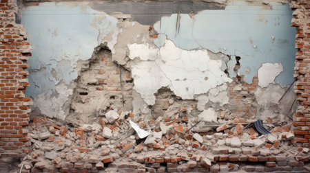 A close-up view of a damaged brick wall with debris scattered on the ground. The scene captures the textures and colors of urban decay, highlighting the contrast between aesthetic design and structural failures.