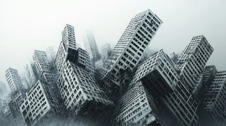 This image depicts a desolate cityscape with several damaged buildings in various stages of construction or destruction. The scene is set against a gray background, emphasizing the bleakness of the environment. The buildings, though incomplete and showing signs of decay, stand as skeletal reminders of what once might have been a thriving urban area. The foreground is littered with debris, rubble, and what appears to be construction materials, adding to the sense of abandonment and neglect.