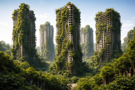 Abandoned Skyscrapers Overgrown with Vegetation in Post-Apocalyptic Green City Landscape